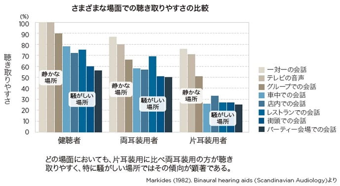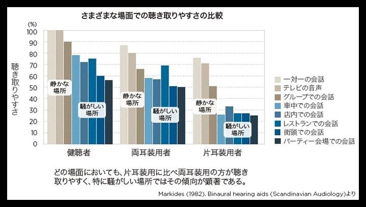 人間の聴覚では、バランスよく音情報が届くことで、左右の脳が協力してすぐれた能力を発揮します。たとえば、多少騒がしい場所でも、周囲のさまざまな音の中から話し相手の声を識別できるというのもその一例です。そんな脳の働きを生かすためにも補聴器を両耳につけることは有効です。また、目を例にとると、左右どちらかの目だけでは、距離感がつかめず歩きにくいばかりか、片方だけに極端な負担がかかるので疲れやすくなります。耳についても同様で、より快適な聞こえを得るためには、左右でバランスよく聞くことが大切です。