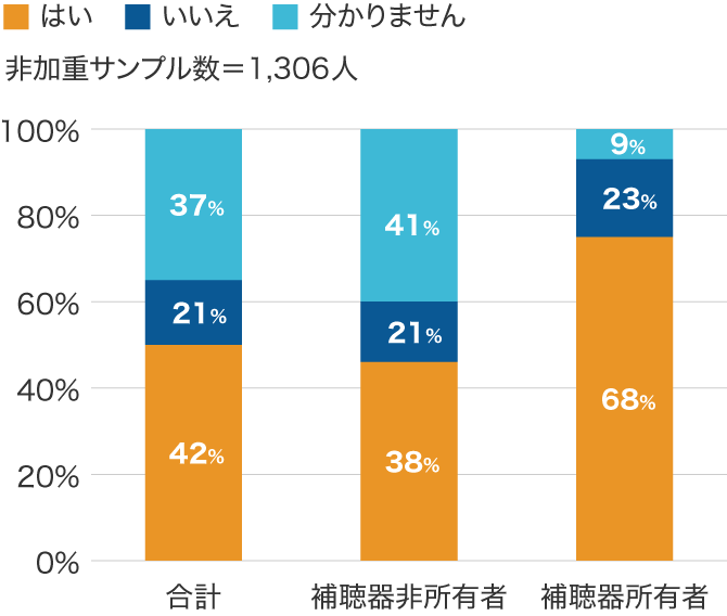 JapanTrak 2018のデータによると、「あなたのお住まいの近くに補聴器販売店はありますか?」という質問に対し、42%の人が「はい」と回答し、「いいえ」と回答したのは21%でした。一方、分かりませんという回答は37%で、ほぼ6割の人は、存在のあるなしをわかっているということができます。もちろん、補聴器を所有している人で、わからないと回答したのは9%しかありませんが、補聴器を所有していない人でもわからないと回答したのは40%程度でした。