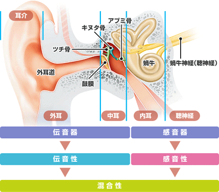 内耳の中に蝸牛という部分がありますが、その中に有毛細胞という音を感じ取る細胞があります。有毛細胞には2つの種類があり、外有毛細胞(約12,000個)、内有毛細胞(約3,500個)と呼ばれています。蝸牛の入口から奥まで、外有毛細胞は3列、内有毛細胞は1列に並んでいます。有毛細胞はその位置する場所によって、分析する音の周波数が違います。蝸牛の入口周辺の有毛細胞が一番高い周波数の20,000Hz位の分析を担当し、奥に向かうに連れて低い周波数の分析を担 当しており、一番奥の渦巻きの中心部分近くの有毛細胞は50Hz位の低い周波数の音の分析を担当しています。