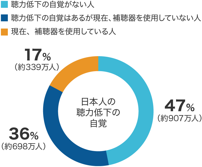 日本における現状をみてみましょう。難聴者の人数に関する推計はいくつか存在しますが、日本補聴器工業会の発表(2015年)によると、世界の中でも高齢化が進んでいるといわれる日本の国内推定難聴者数は約1,994万人、全人口の15.2%と試算されています。しかし1994万人の推定難聴者のうちで、自分の聴力の低下に気付いている人はほぼ半数(53%)であるという数字があります。