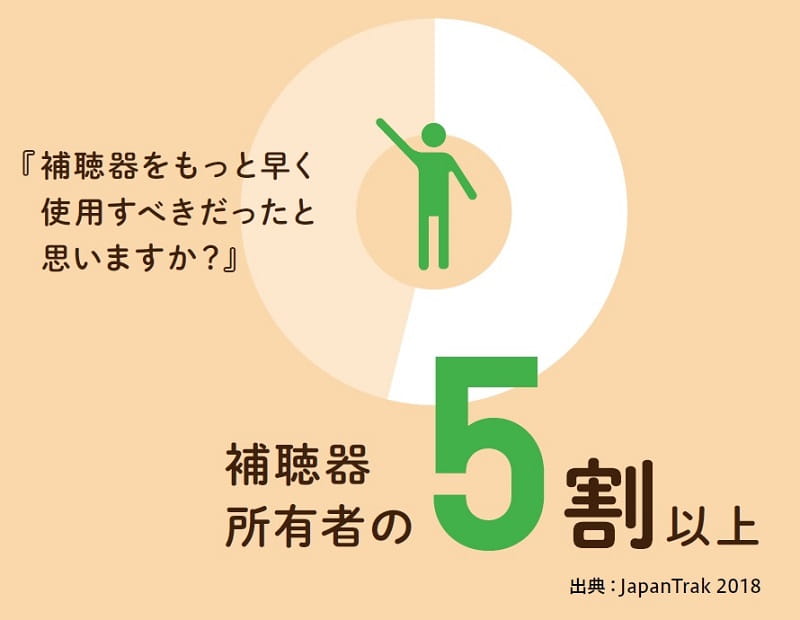 さらに、JapanTrak2018によると、難聴に気付いてから補聴器を購入するまでに平均4~6年が経過しているというデータがあります。聴力の低下は自覚しにくい上に、たとえ自覚したとしても、「補聴器、自分には関係ないよ」「興味はあるけれど、まだ早いかな」というように、補聴器による問題解決を先送りにしていることがうかがえます。